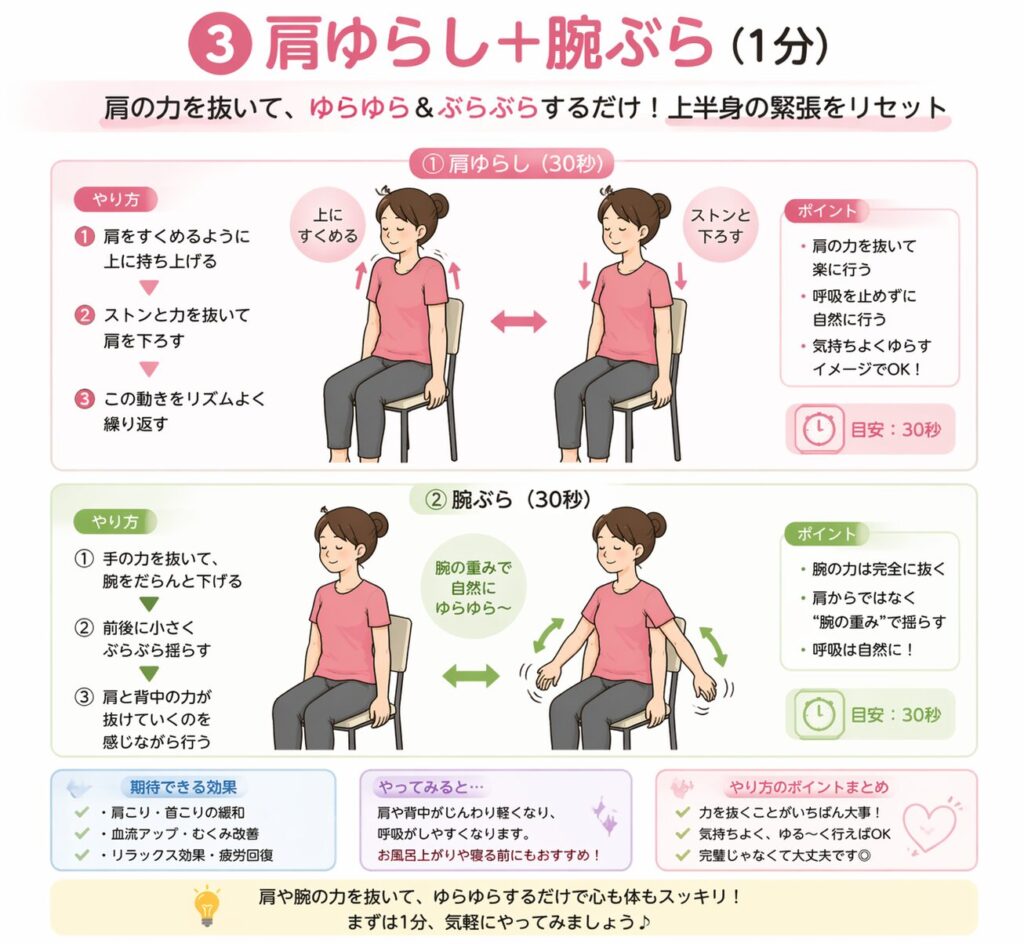 ③ 肩ゆらし+腕ぶら(1分)