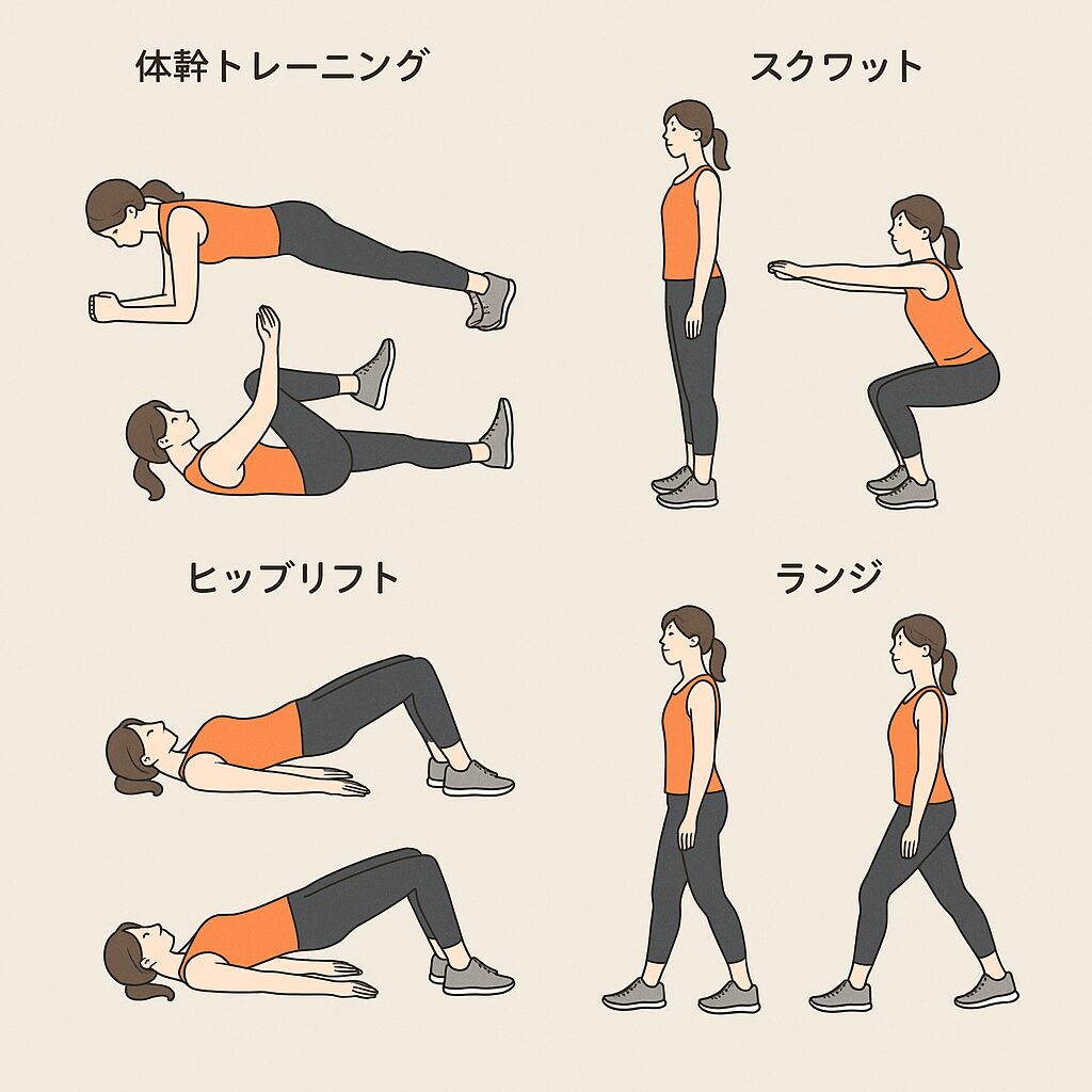初心者女性が安心して取り組めるのは、「体に負担をかけすぎず、女性らしい体型づくりに直結するトレーニング」です。ここでは代表的な4つを解説します。