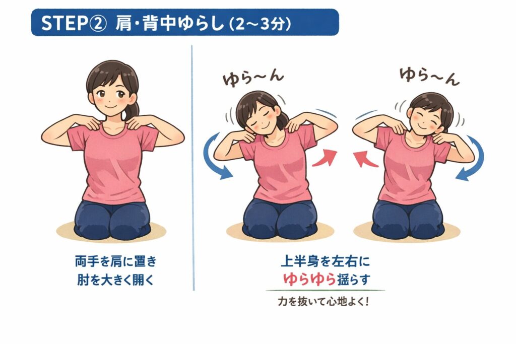 ✔ STEP② 肩・背中ゆらし(2〜3分)