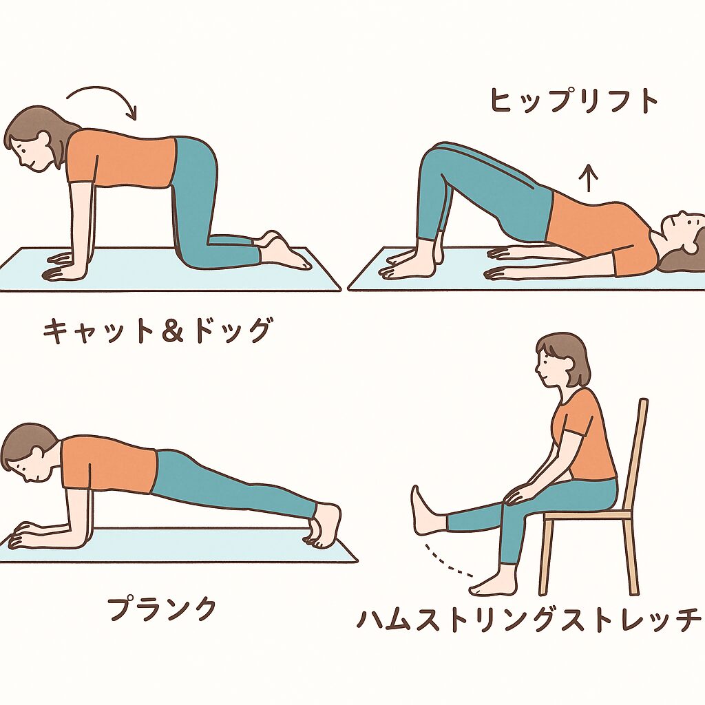 - 下半身強化(スクワット・ヒップリフト)で骨盤安定化