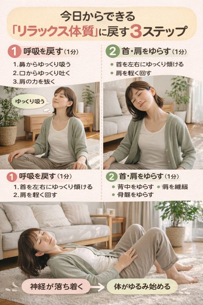 体がずっと緊張している人は、こちらの記事も参考になります。