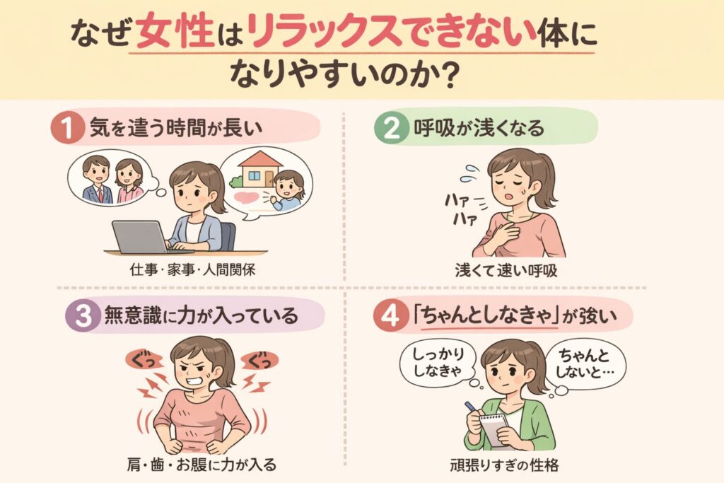 女性は日常生活の中で、無意識の緊張を溜め込みやすい傾向があります。