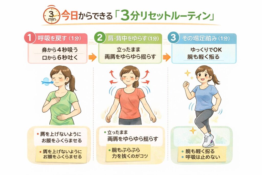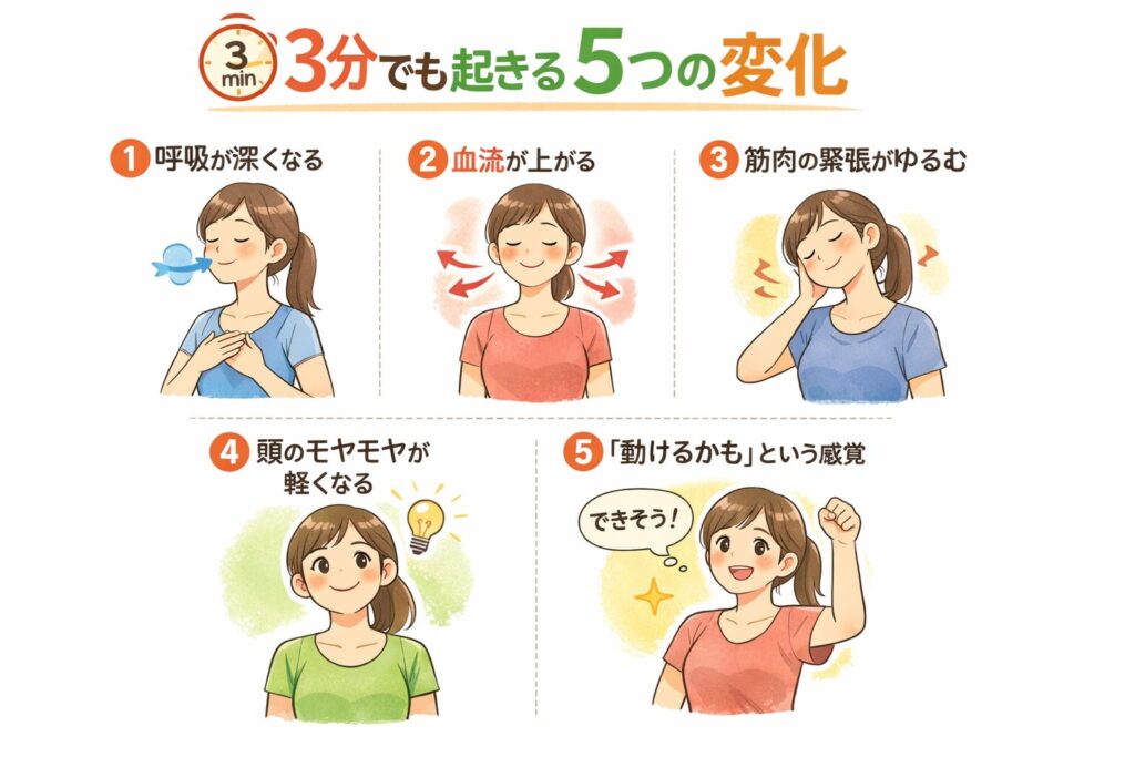 体が重い日、動いたほうがいい?女性に必要なのは「3分の回復スイッチ」でした 朝、目は覚めたのに――体がベッドに沈んだまま、動きたくない。 熱はない。風邪でもない。でも、なんか重い。 肩がずっしり。腰がだるい。気持ちまで重たい。 そして、頭...